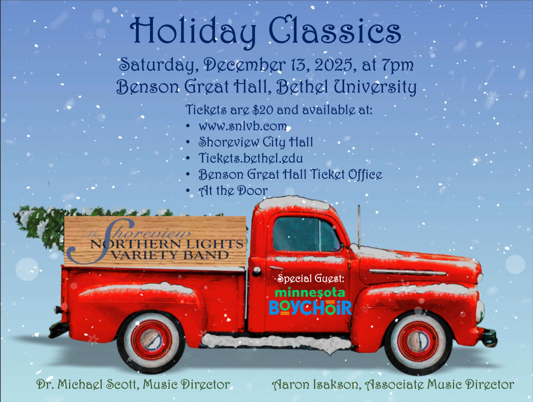 Our 2025 Holiday Concert, Holiday Classics, is scheduled for Sat., Dec 13, at 7pm in Benson Benson Great Hall at Bethel University. Tickets for the concert will go on sale, mid Fall.